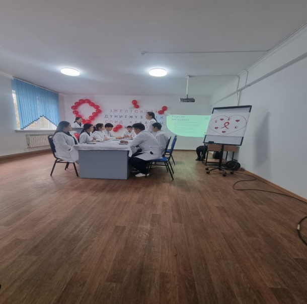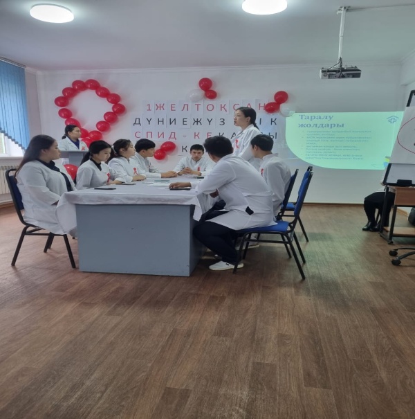 3-желтоқсан күні Дүниежүзілік СПИД-ке қарсы күрес күніне орай дөңгелек үстел өткізілді.Тақырыптың қазіргі таңдағы өзектілігі мен маңыздылығы талқыланды.Ғасыр дерті атанған аурудың жұғу жолдары мен қауіпсіздік шаралары түсіндірілді.Жастар арасында салауатты өмір салтын насихаттаумен қатар зиянды әдеттерден аулақ болуға насихаттап,зиянды әдеттердің зардаптары туралы айтылды.Тақырыпты талқылау кезінде дүниежүзілік статистикалық мәліметтер мен қатар еліміздегі де сырқаттанушылық саны жайлы мәліметтер келтірілді.Топтың ат салысуымен презентациялық жұмыс дайындалып,